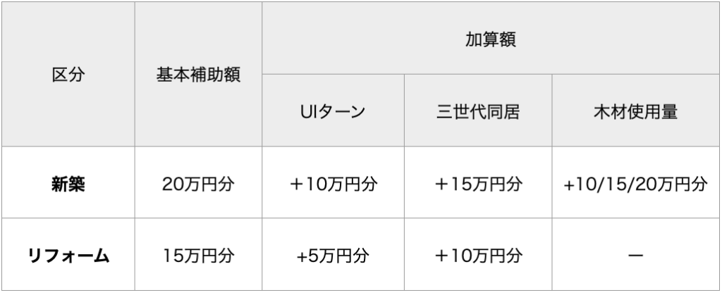 この事業は、特定のライフスタイルを選択する世帯を手厚く支援します。基本補助額に、条件に応じて以下の金額分の木材またはポイントが加算されます。