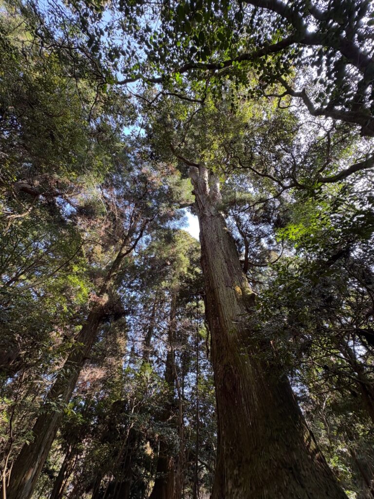 車を降りて裏の道を少し進むと、目の前に現れたのは空に向かってまっすぐ伸びる巨大な杉。