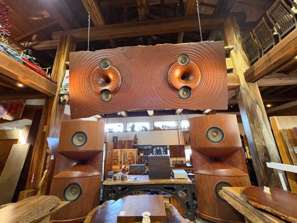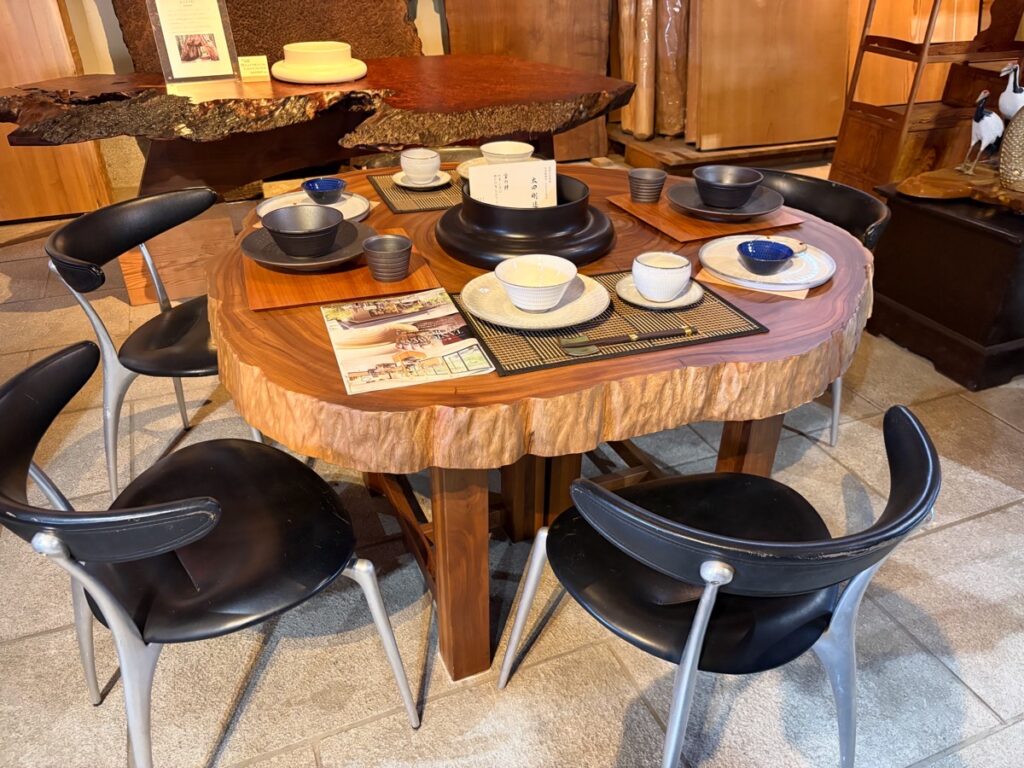 店内には大きな一枚板のテーブルや、巨大な丸太から作られた家具が並び、木の迫力と美しさを改めて実感!
